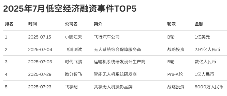 2025年7月,低空经济融资热度持续,融资事务TOP5揭晓行业投资风向,榜单前四融资金额均达亿元级。小鹏汇天做为飞翔汽车公司,于7月15日完成B轮1亿美元融资,凭仗立异品类抢占低空交通新赛道。