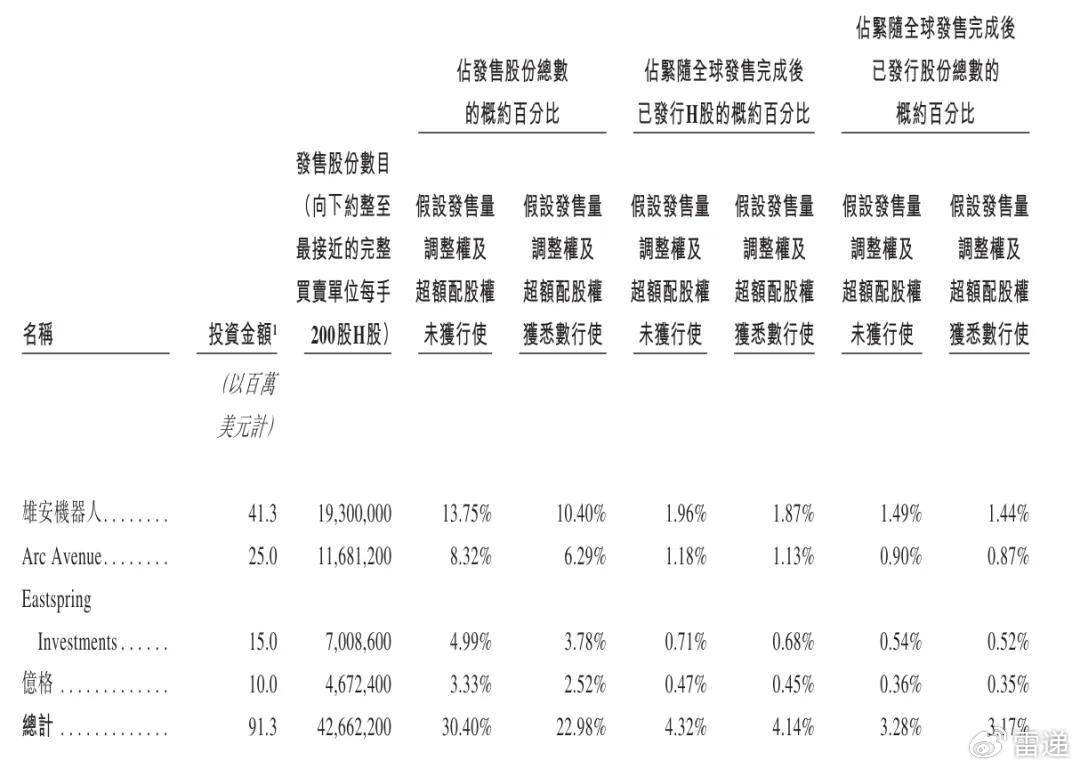 极智嘉基石投资者别离为雄安机械人、Arc Avenue、保诚旗下国际长线投资机构Eastspring Investments、亿格,一共认购9130万美元。此中,雄安机械人认购4130万美元,是最大的基石投资者。
