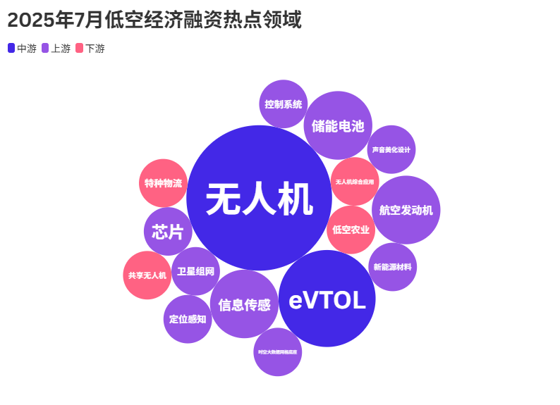 2025年7月,低空经济融资热点范畴图谱清晰脉络。无人机取eVTOL(电动垂曲起降飞翔器)成为焦点聚核心,凸显其正在低空经济生态中的环节地位。